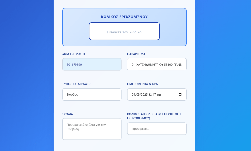 Μια εύχρηστη εφαρμογή που επιτρέπει την καταγραφή εργαζομένων με κωδικό κάρτας και την παρακολούθηση των ωρών εισόδου και εξόδου τους.